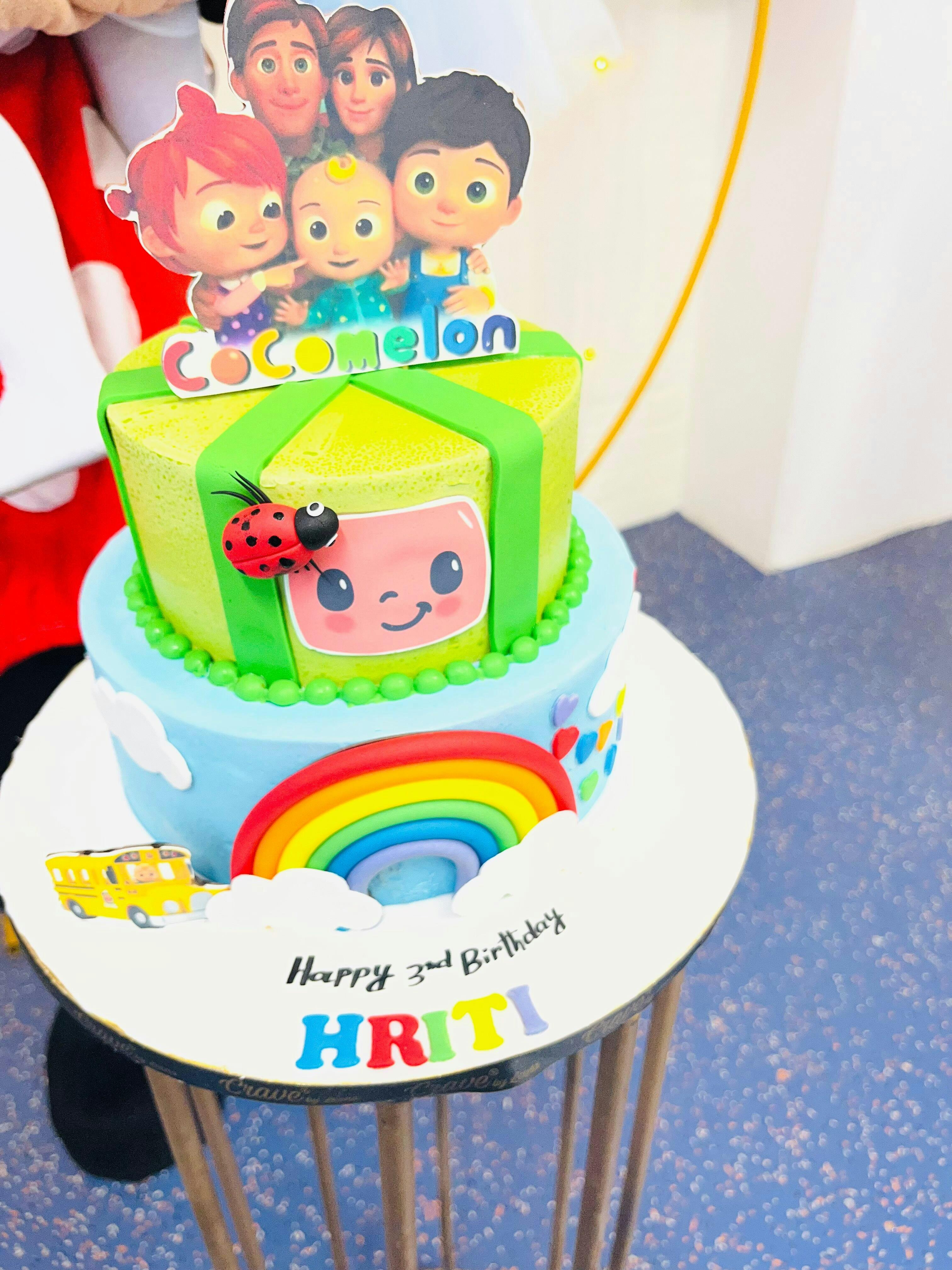 A fun two tier cake covered in Vanilla buttercream with edible prints of the Cocomelon characters and a fondant rainbow.