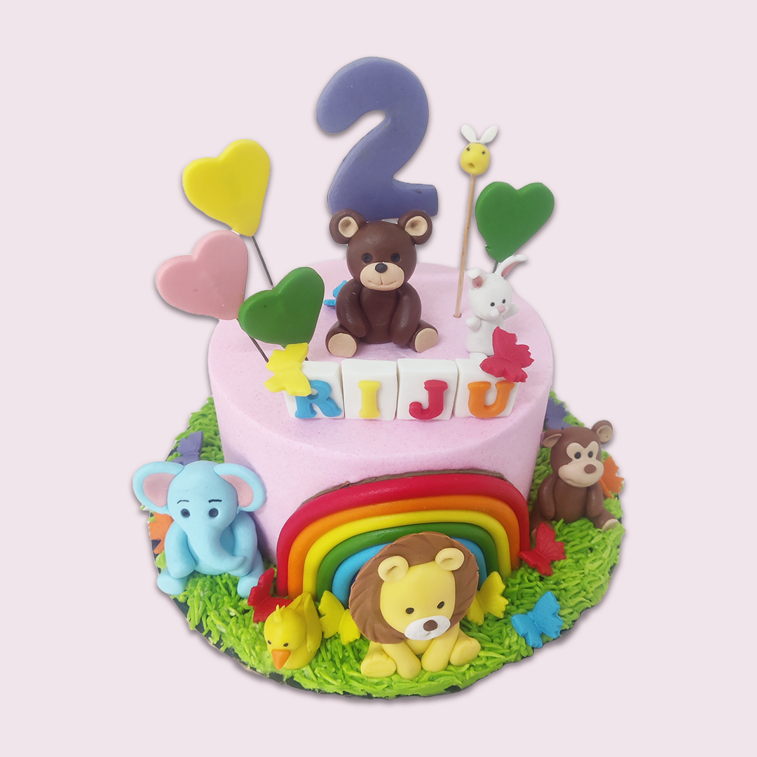 This would be a 1.5KG vanilla choco noir cake covered in PINK colour buttercream colourful butterflies elephant, lion and monkey+ duck on the base board 7 COLOUR Rainbow on the wall of the cake colourful hearts on the sticks age number on the stick bear and bunny fondant on top fondant name blocks “RIJU” in different colours 3 honey bees on base and top