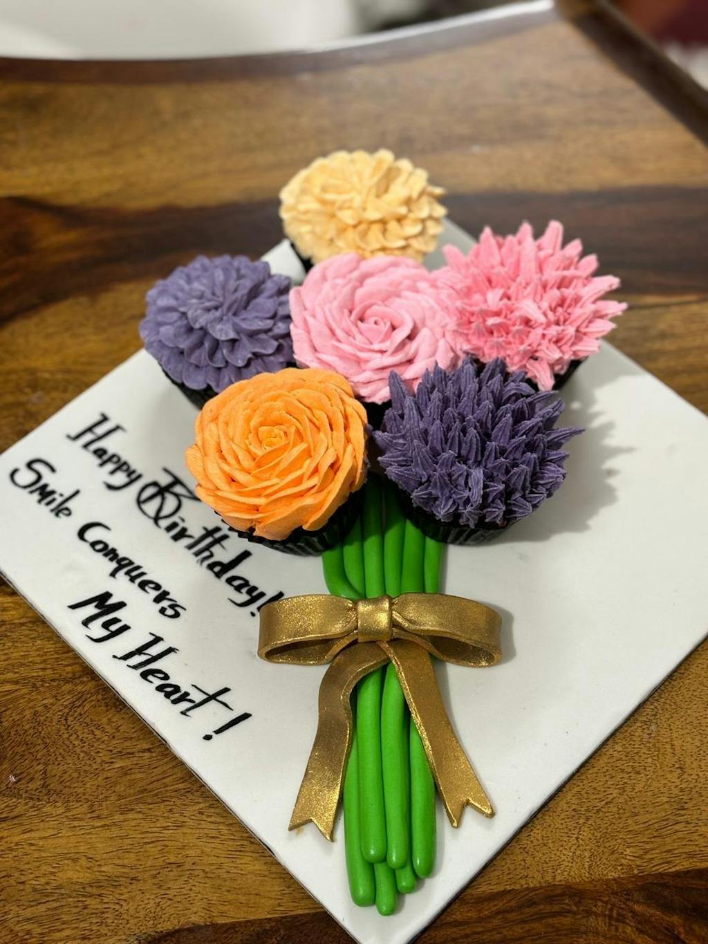 A beautiful cupcake bouquet with hand-piped buttercream flowers with fondant stems and a golden bow.
