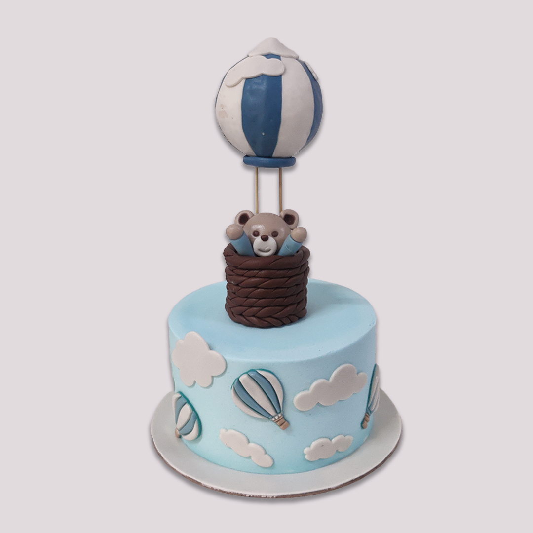This will be a 1.5kg White &Black cake covered in Pastel blue buttercream, with Teddy in a basket and a Hot air balloon in fondant, with 2D fondant clouds around the cake,