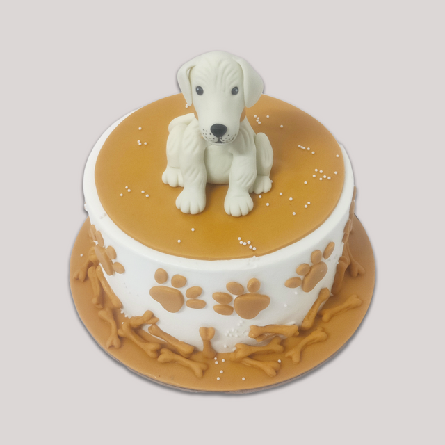 This will be a 1kg Chocolate Truffle cake covered in Off white buttercream, with similar paws around the cake in dark beige(There will be changes in Paws) and Dark beige buttercream on top with Similar kind of Dog as topper