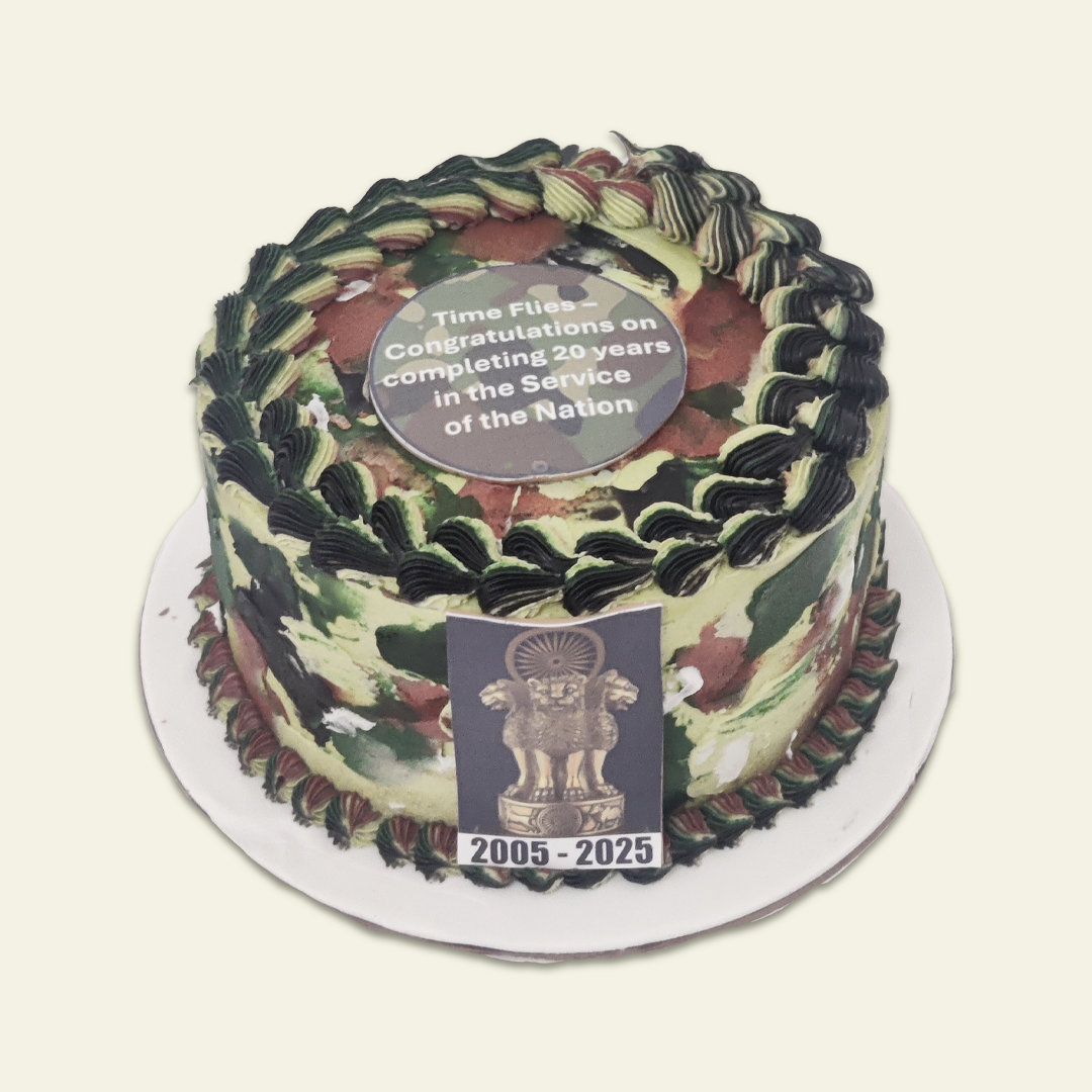 This will be a 1kg Chocolate Truffle cake covered in similar color combination buttercream, and National emblem on the wall , with 2005-2025 edible print