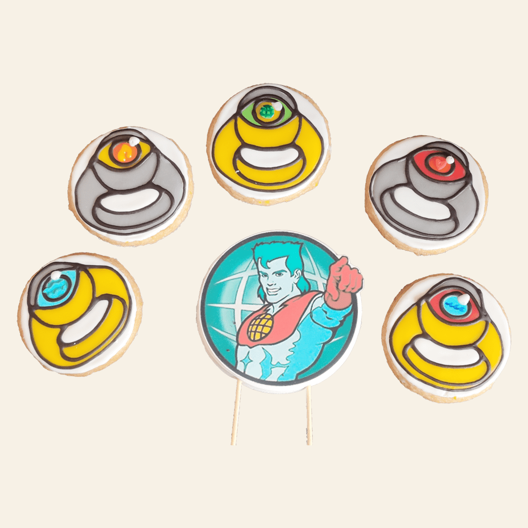 Adorable sugar cookies with hand-piped Captain Planet and the power rings decor.