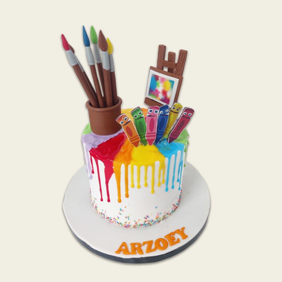This would be 2KG, Single tier Vanilla Chocolate Chip cake covered in buttercream, with colorful drips, with colorful sprinkles around the bottom wall as per the image. No color inside. Add a small canvas, 2, 2D crayons and paint brushes on top