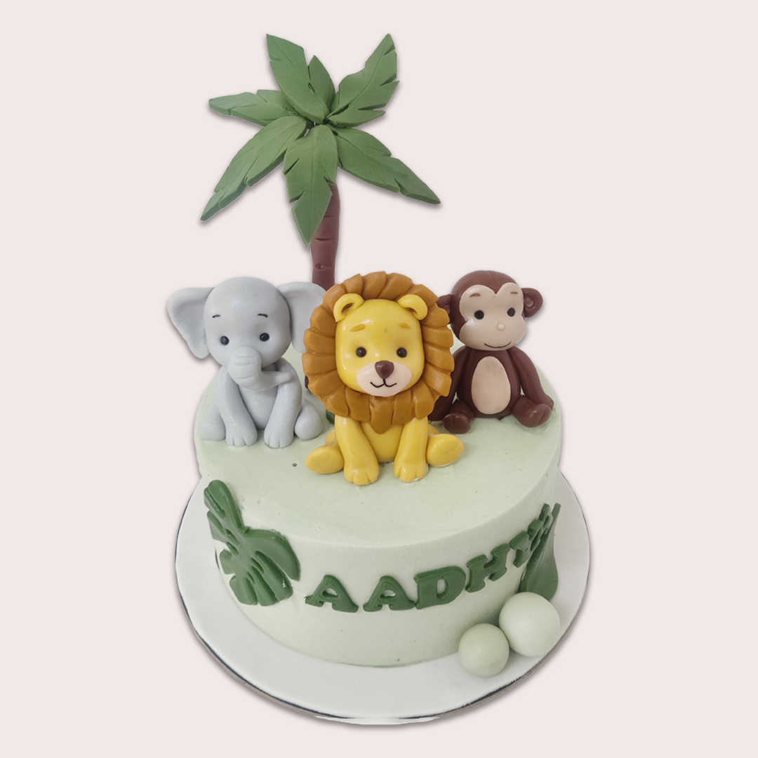 This would be a 1Kg vanilla chocochip cake covered in pastel green buttercream with 3fondant doll figurines and 1 coconut tree and leaves similar to theimage.