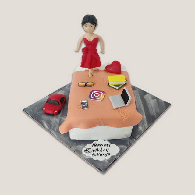 This will be a 1.75kg Chocolate Truffle cake covered in Fondant, with similar color fondant bed spread, a dancing girl on top of the cake and with Instagram logo on the cake, with Laptop, googles, and phone, fondant heart, and a tiny car