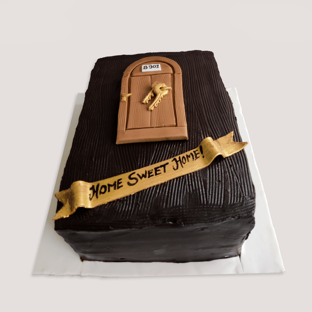 A beautiful cake for a house warming covered in decadent chocolate ganache with a handmade fondant door and keys.