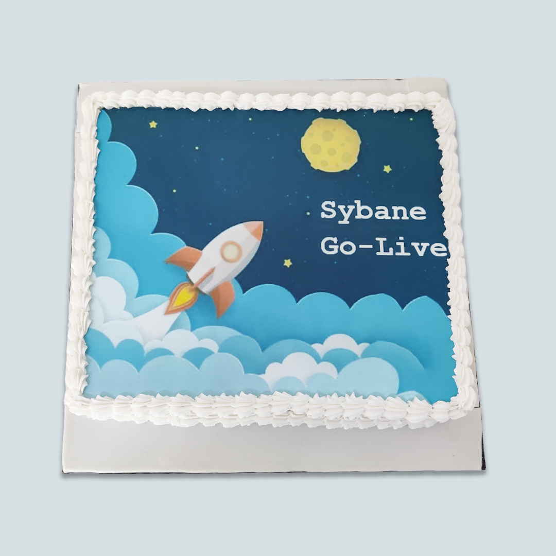 This will be a 2.5kg square-shaped Almond joy with Edible print of the Logo shared and addressed and with the message PT 2.0 Go Live Success