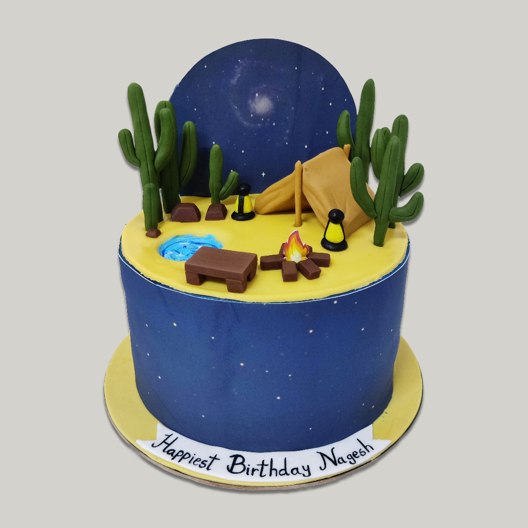 This will be a 1.5kg Almond Joy cake, covered in edible print, with similar-looking fondant 3D Trees, Tent, Bench near the fire, lamp, and stones, and a pond