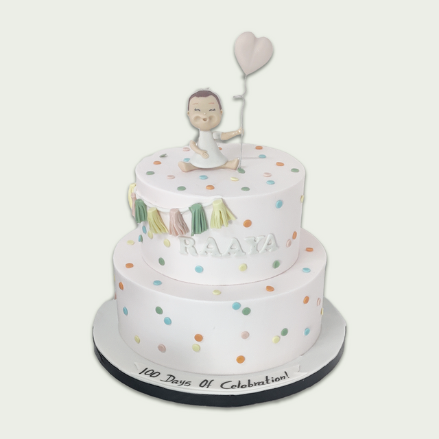 This would be 3KG, 2Tier Chocolate Walnut Fudge cake covered in buttercream, with fondant toppers and decors as per the image. on top tier wall, child’s name in fondant cut out and on the board, the message - 100 Days of Celebration!.