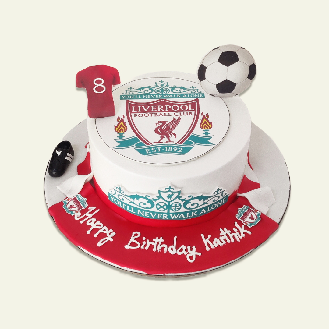 This will be a 1kg Almond Joy cake covered in White Buttercream, with a Message on the cake board and a Red scarf on the cake board, and other fondant works, one shirt of red colour with number 8 in edible print, and Fondant boots