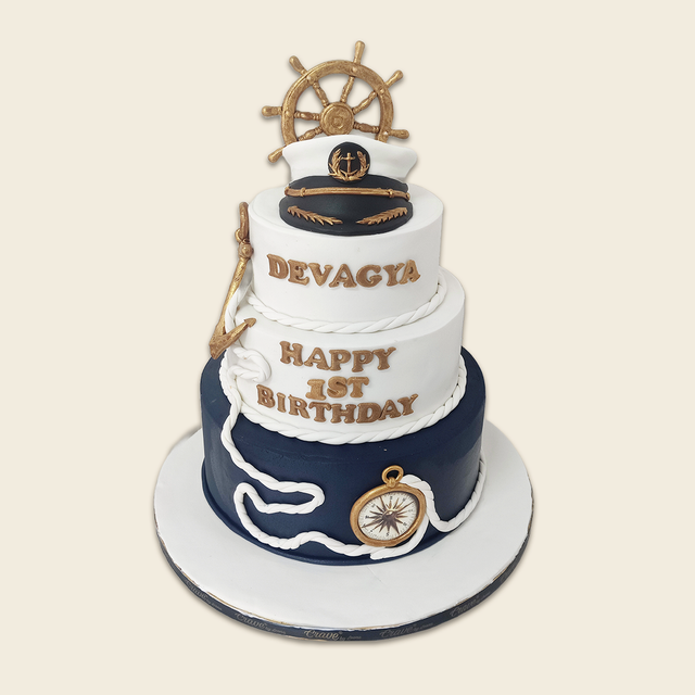 This would be a 4KG 3 tier Chocolate Truffle the bottom and the center tier will be edible and top tier would be in edible covered in fondant- the decor will be dispearsed across the 3 tiers. the compas will be in the bottom tier made in 3D fondant , the ripes across the bottom 2 tiers with an anchor in between the middle and bottom tier