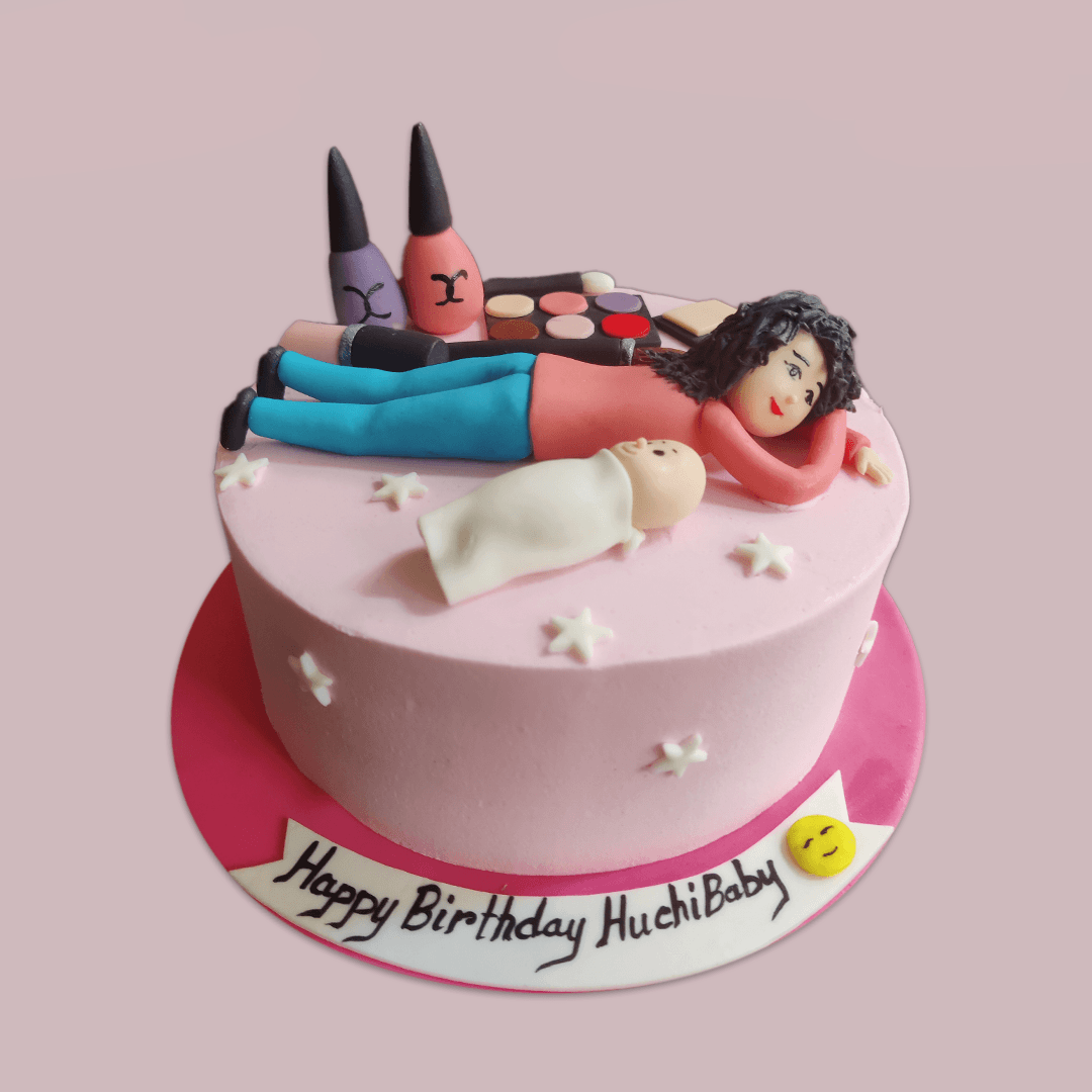 A cute cake covered in smooth Vanilla buttercream with handmade fondant toppers of a mom, baby and her make up essentials.