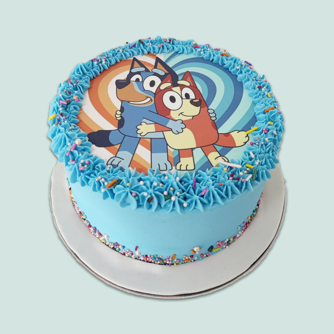 This will be a 1kg Vanilla choco noir cake covered in Light blue buttercream with the cartoon’s image edible printed on top of the cake with buttercream kisses similar as seen