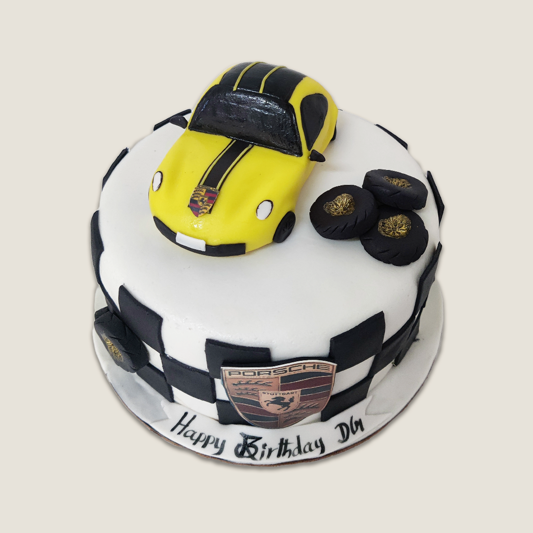 This would be a 1.5Kg vanilla chocolate chip cake covered in fondant with checks on the wall and a porsche logo on the wall. With a 3d car on top of the cake + the fondant tyres