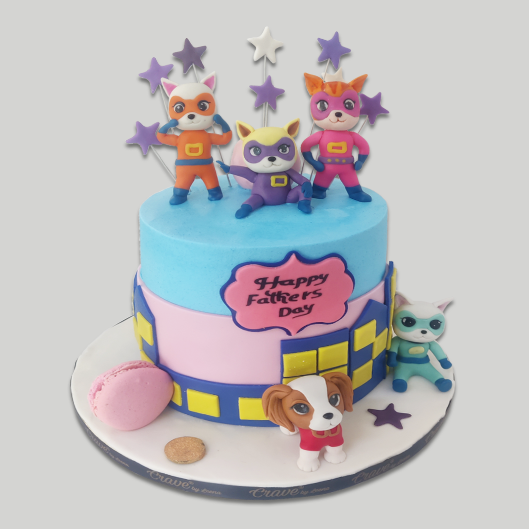 This will be a 2kg Chocolate Truffle cake covered in Blue buttercream with Light pink at the bottom half covered in Light pink, and with 3D fondant figurines and one Macaroon at the base of the cake similar as seen