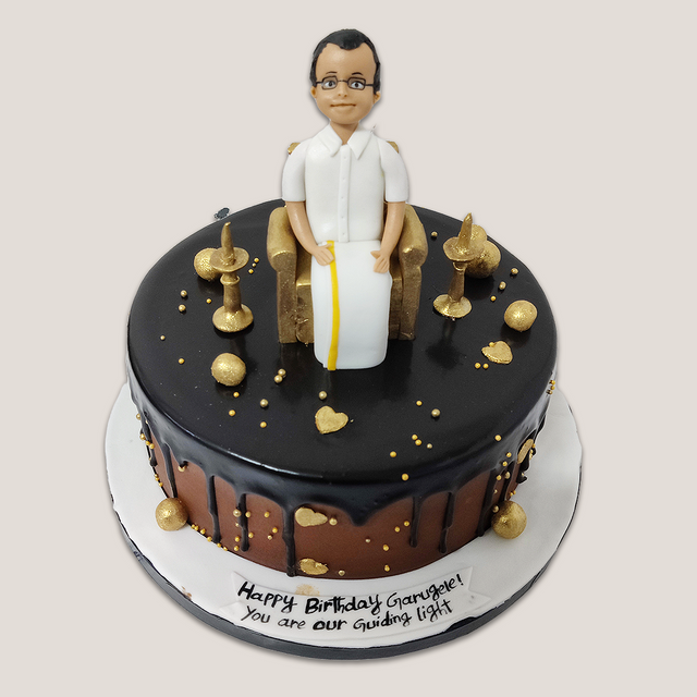 This would be 2KG, Chocolate Walnut Fudge cake covered in buttercream with ganache drip, 3D fondant Male figurine on the topper sitting on the chair and 2 fondant traditional lambs standing left and right side of the figurine on top, fondant balls and sprinkles.