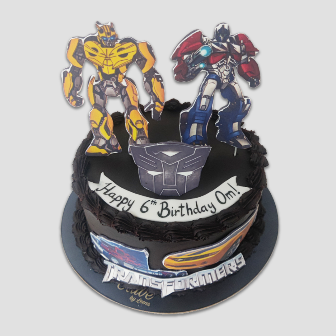 This will be a 1kg Chocolate Truffle cake covered in chocolate ganache, piping around the cake with edible prints of the characters and vehicle on the cake wall, with a Transformers face in between the standing characters and Tansformers on the cake wall